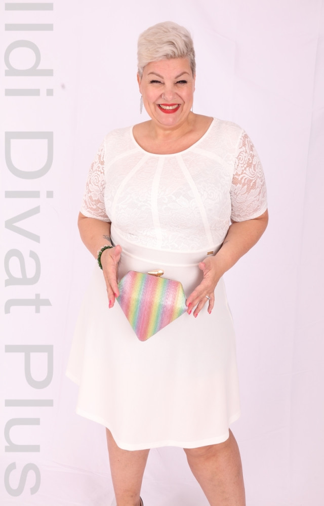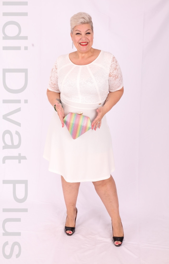 Classis fehér színű, kerek nyakú, felső részén csipkés, A-vonalú ruha.