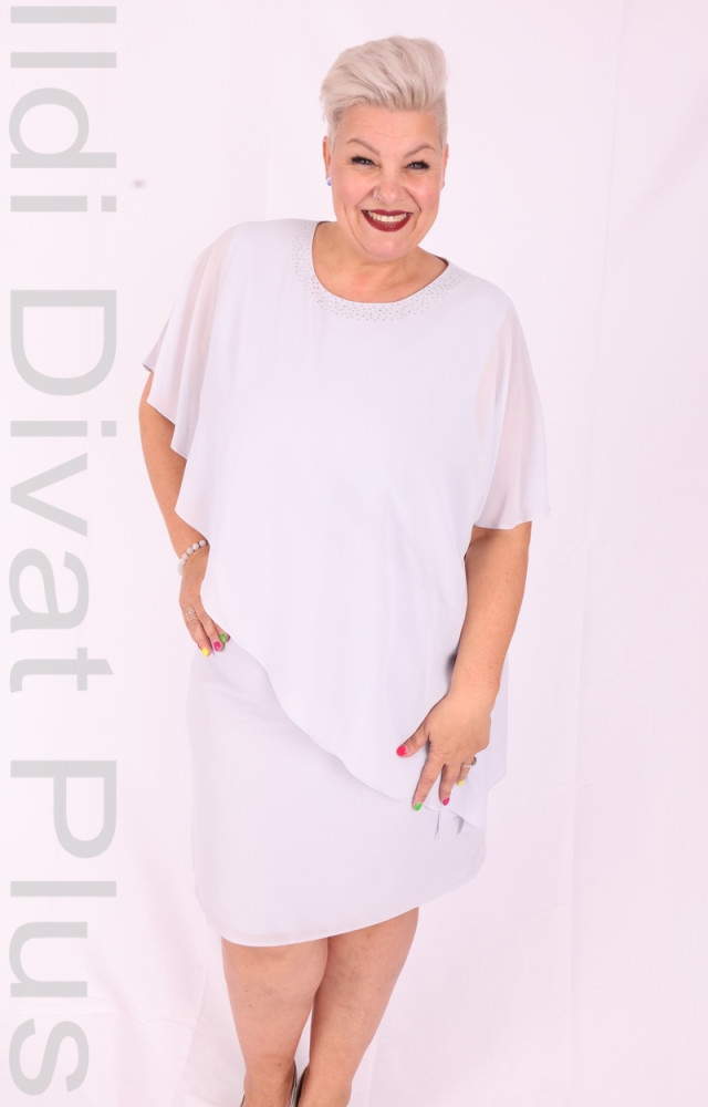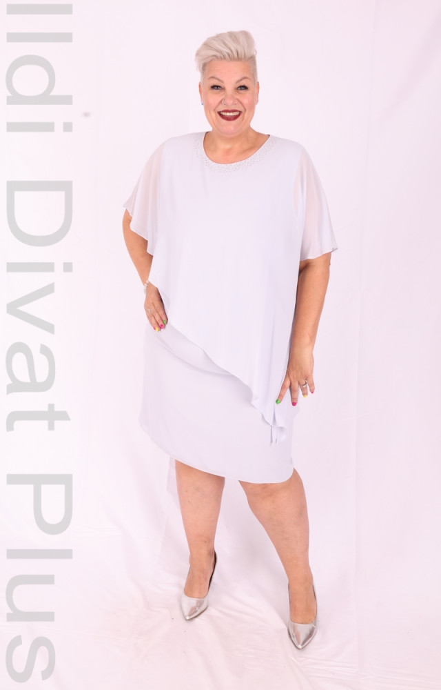 Zan-Mar szürke színű, kerek nyakú, nyakán kő díszítéses, muszlin rátétes, karcsúsított fazonú alkalmi ruha.