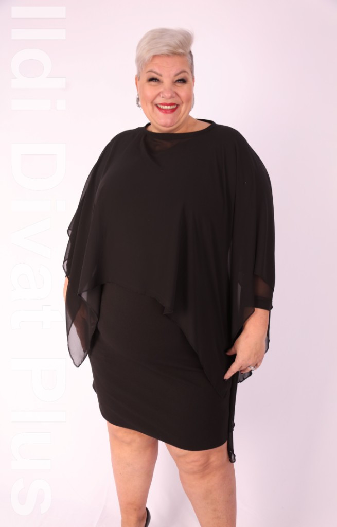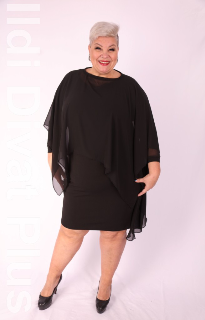 Classis fekete elején rövid hátulján hosszított muszlin poncsó.