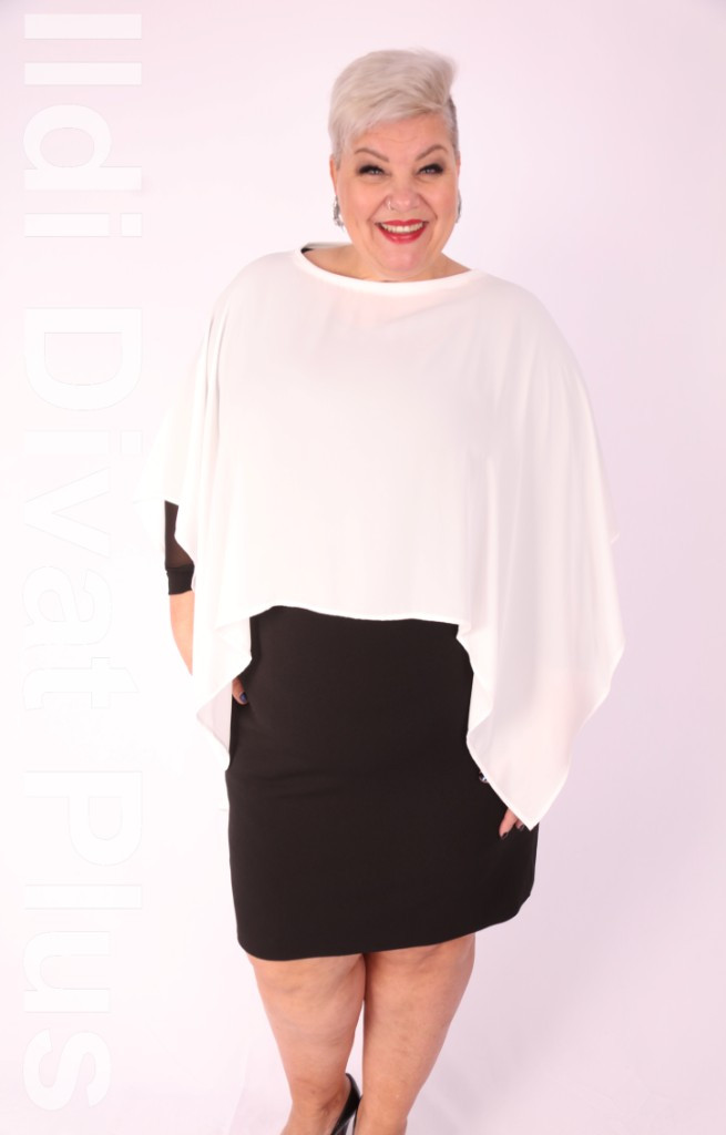 Classis fekete elején rövid hátulján hosszított muszlin poncsó.