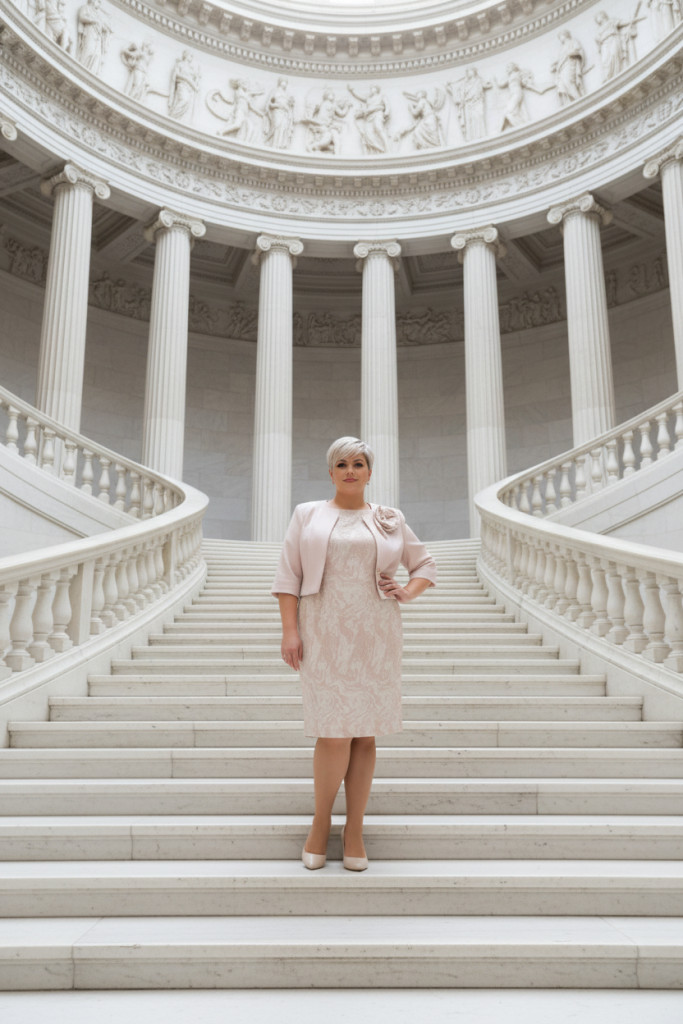 Púder-arany mintás egyenes szabású rövid ujjú ruha+ púder blézer.