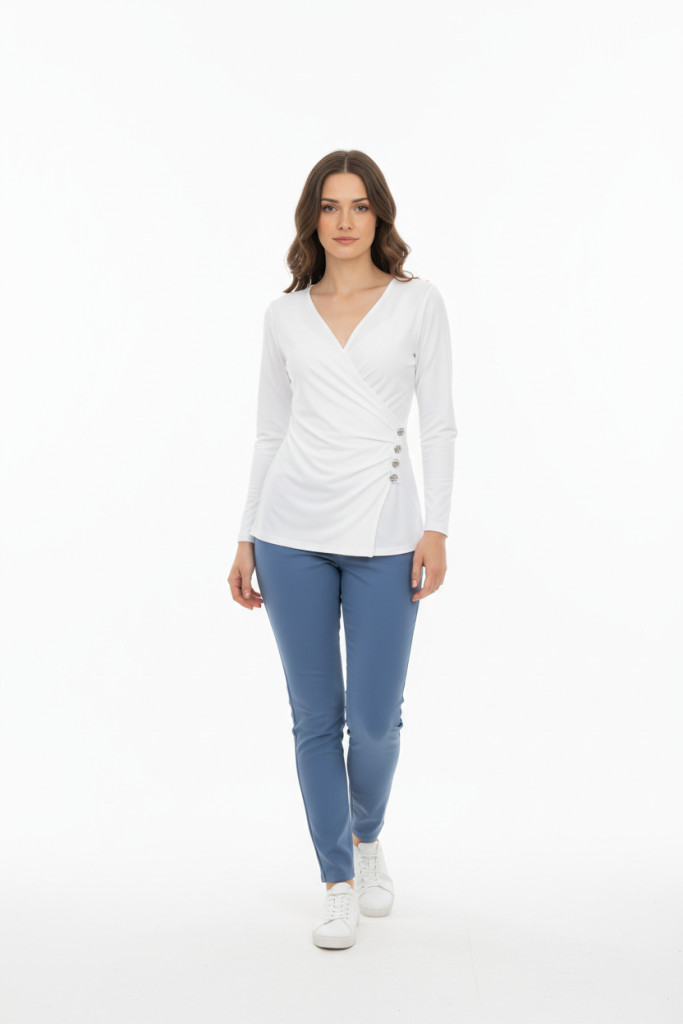 Mandala fehér mellén átlapolt 3/4 ujjú felső.