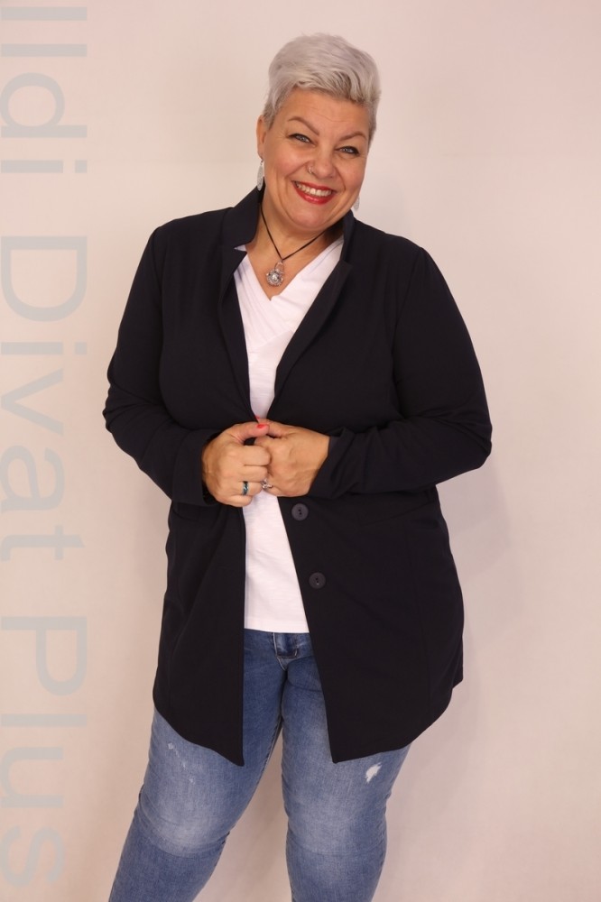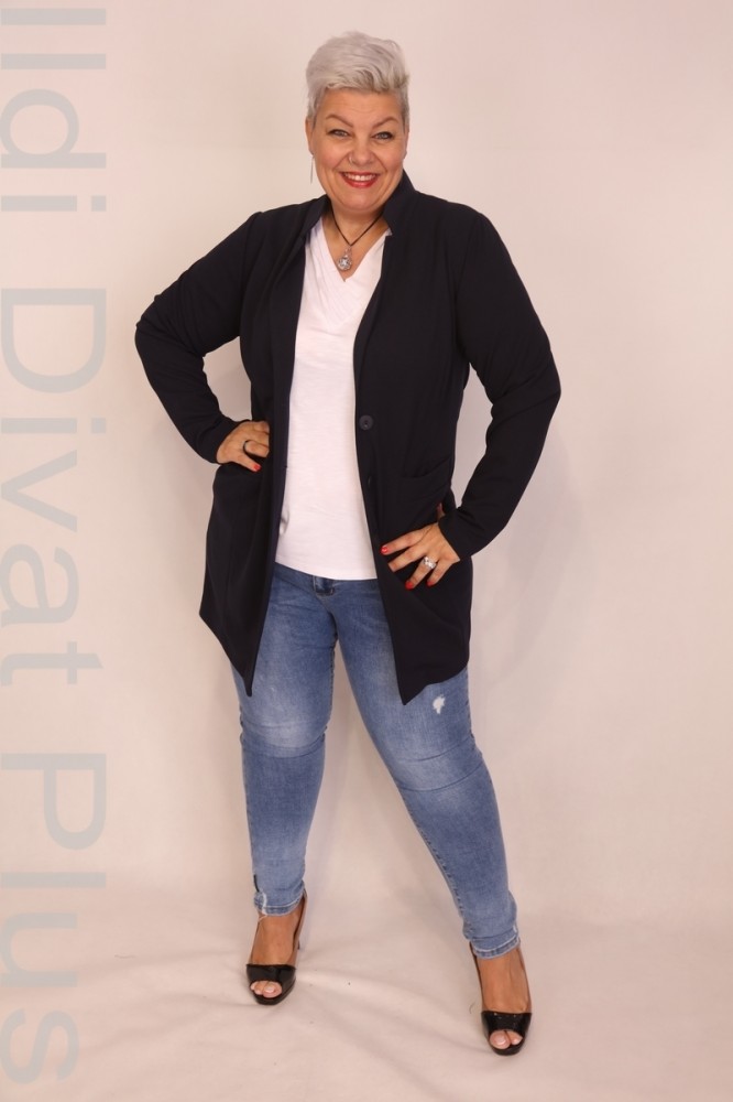 Caremo sötétkék színű, galléros, gombos, hosszított blézer.