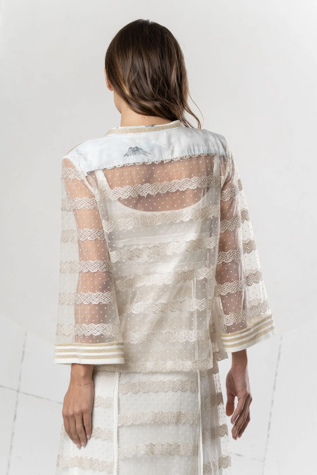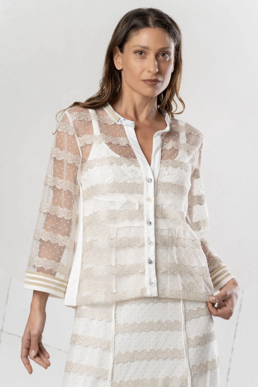 Bézs tüll blúz. Hímzett, csipkemintás, lurex cérnával és mikro pöttyökkel. Csíkos kötött mandzsetta. Puha blúz sikkes, nőies és romantikus megjelenéshez.