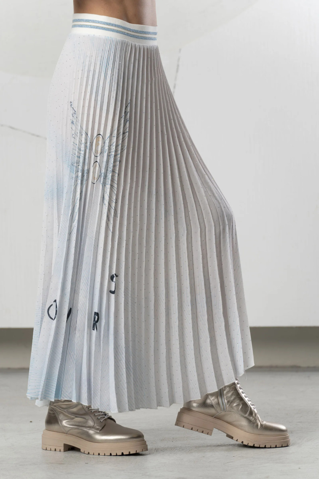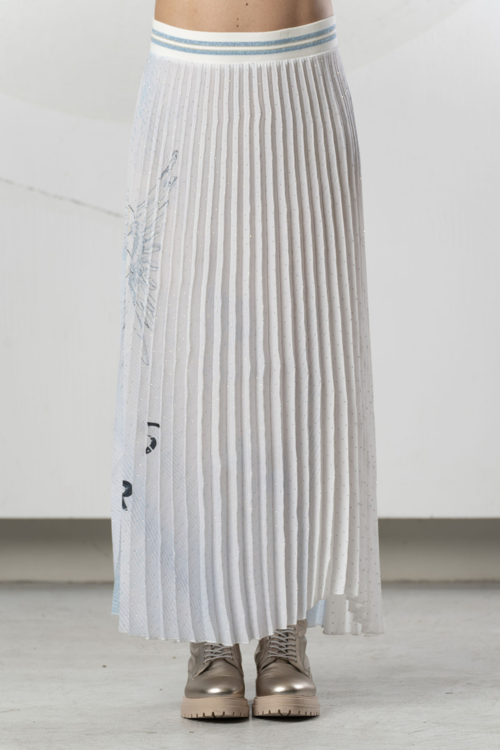 Hosszú, rakott szoknya rombuszmintás anyagból, kristályokkal és világoskék árnyalatú szárnymintával. Fehér kötött és lurex derékpánt. Hosszú szoknya sikkes hétköznapi megjelenéshez.