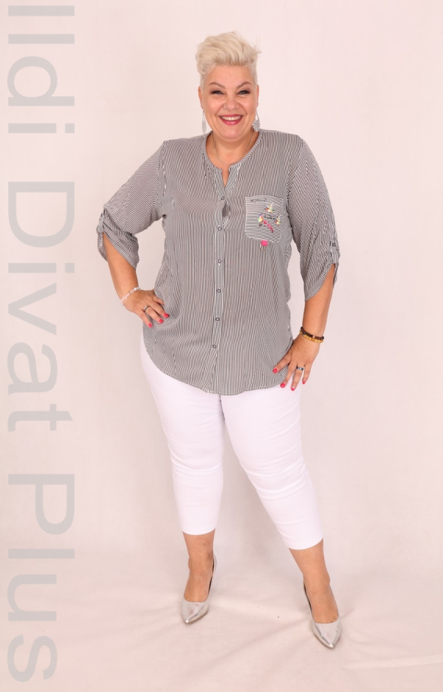 Grandi fekete-fehér csíkos, gombos, galléros, zsebes, lezser fazonú felső.