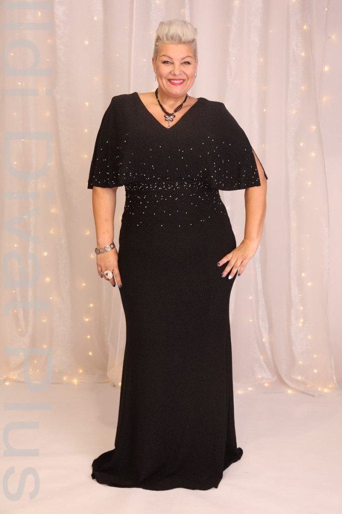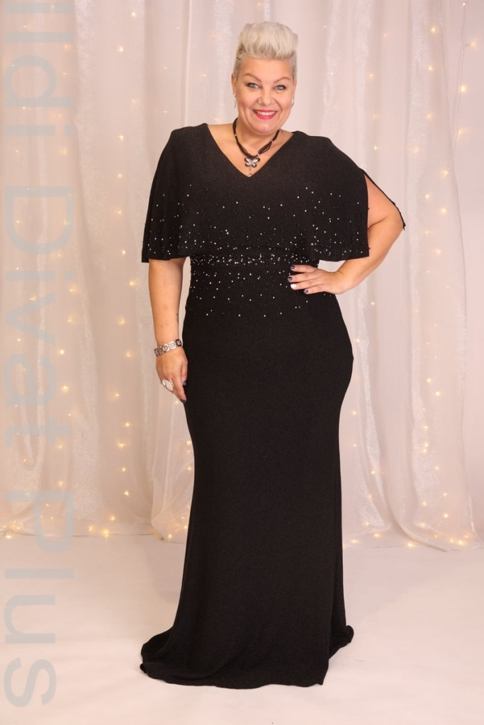 Favana fekete-ezüst köves gyöngyös csillogós derekán szabott alkalmi maxi ruha.