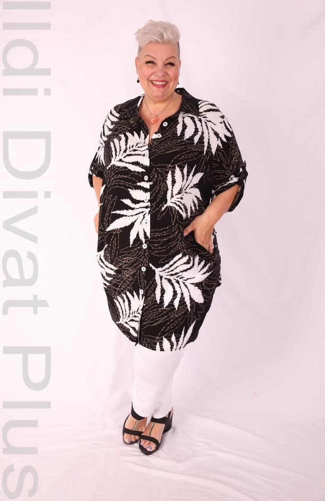Eseoglu fekete alapon fehér mintás gombos galléros ingtunika.