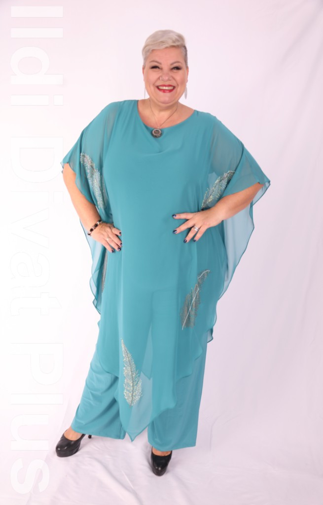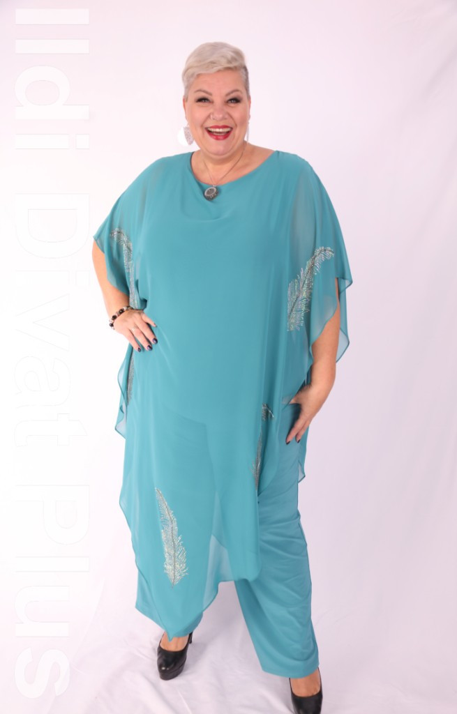 Türkiz színű, toll mintás, köves, muszlin overál.