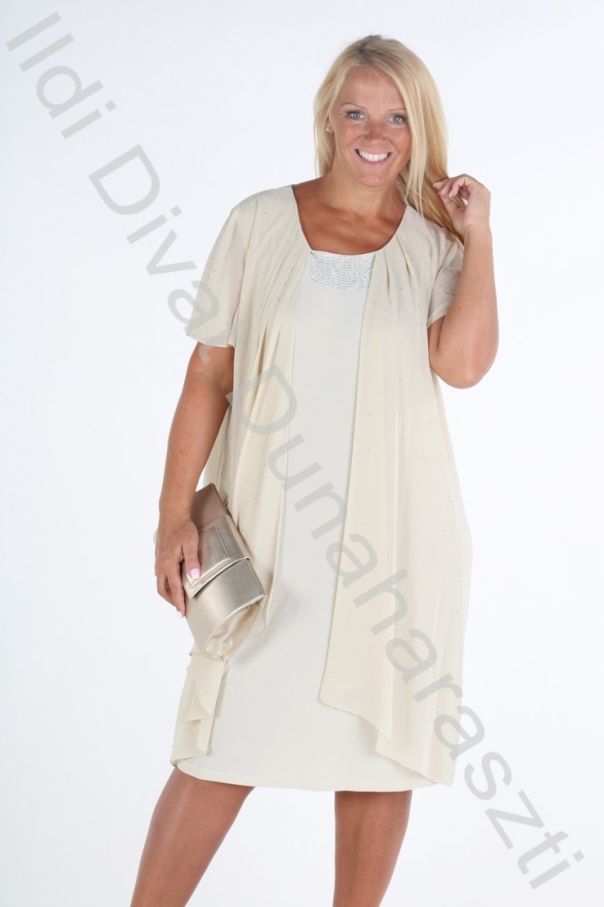 Hesba beige színű, nyak részén strasszos, muszlin rátétes, lezser fazonú ruha.