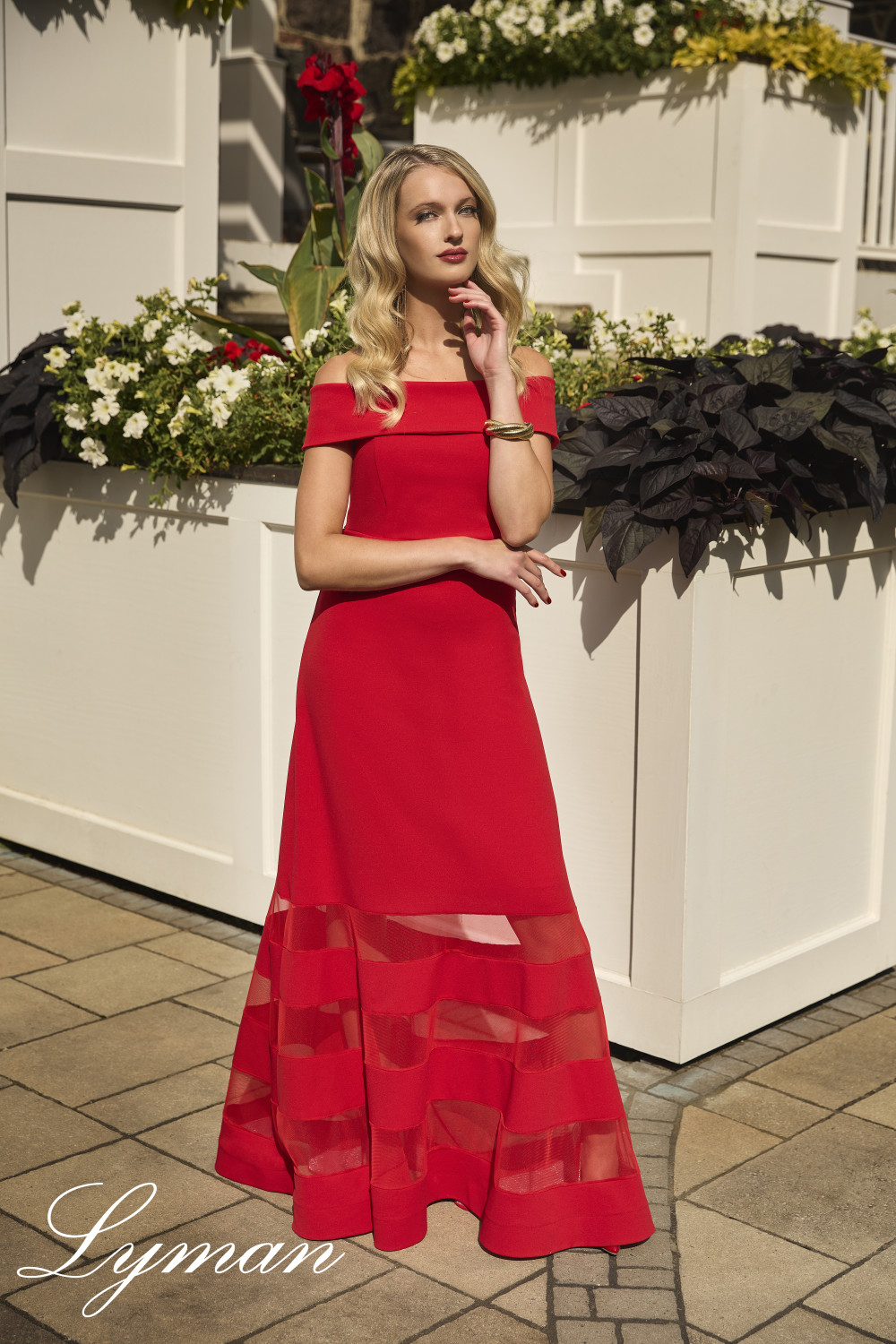 Frank Lyman piros színű, vállra húzható, alján neccbetétes, derék részén karcsúsított, lefelé bővülő fazonú ruha.