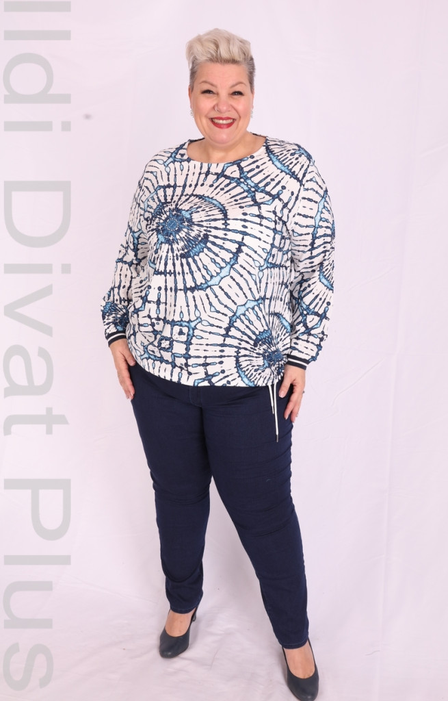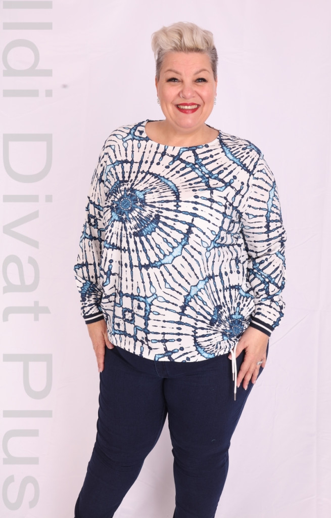 Joy Of Life fehér-kék mintás alján kötős blúz.