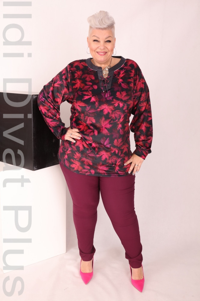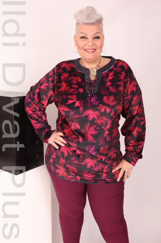 Fuxia mintás, nyakán fűzős, bársony anyagú tunika.