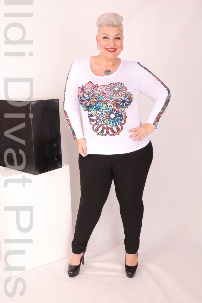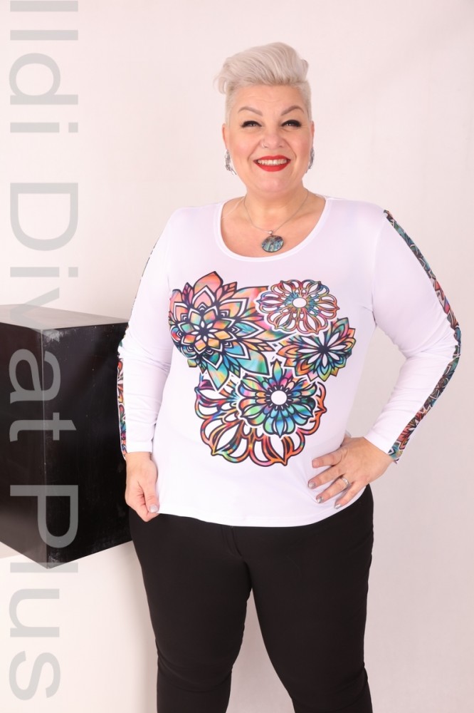 Livello Di Vita fehér alapon manadala mintás, kerek nyakú, ujján mandala mintás neccbetétes, karcsúsított fazonú felső.
