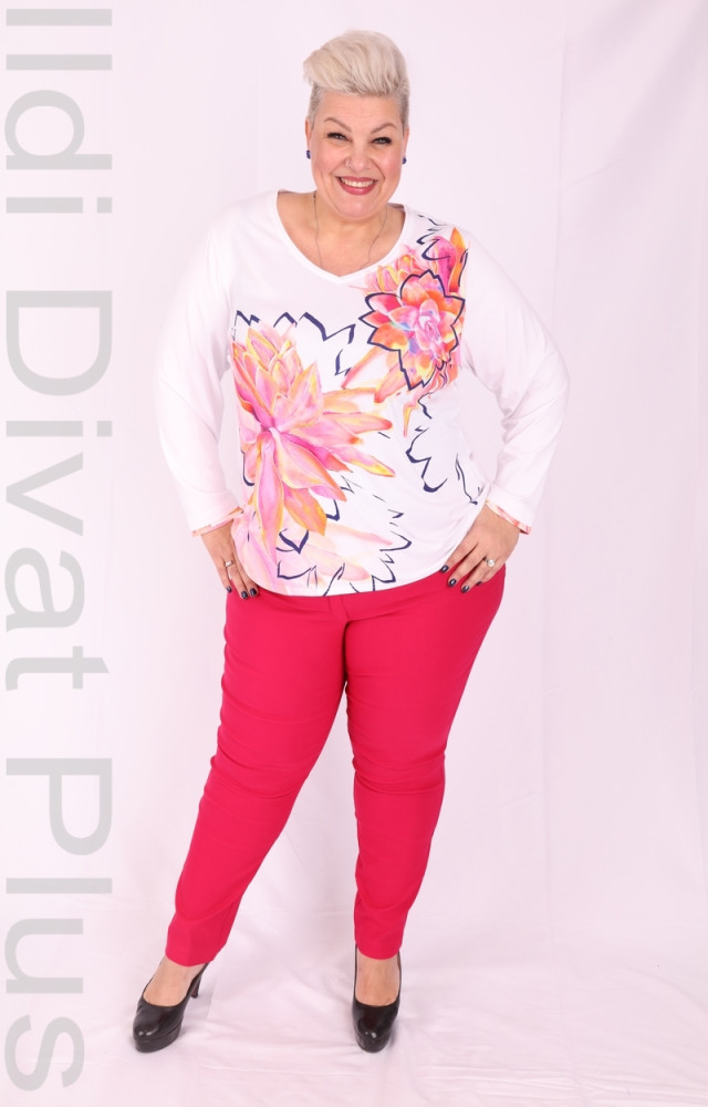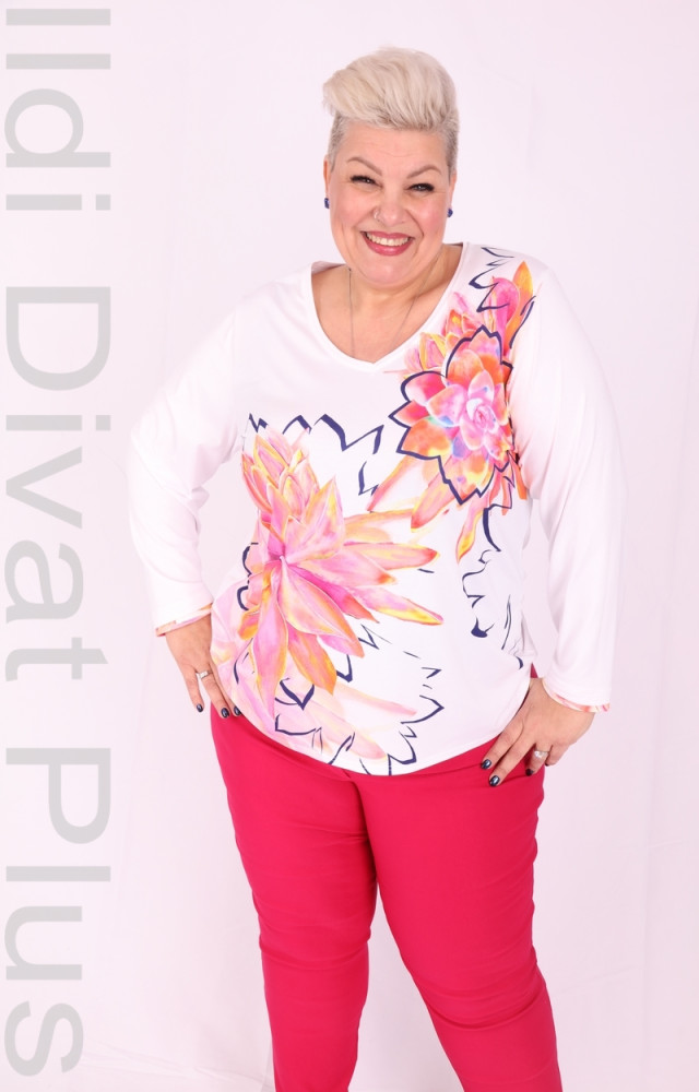 Fehér alapon színes mintás felső.
