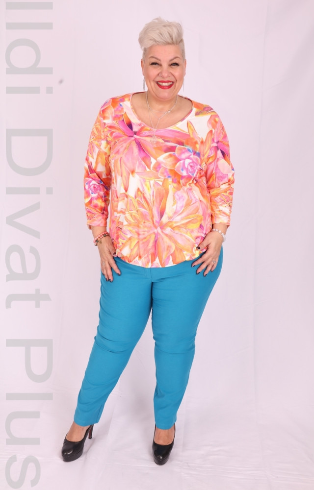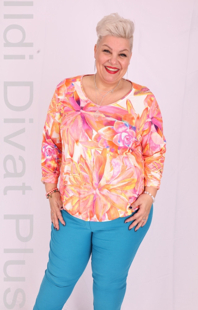 Narancs mintás V nyakú gumis aljú felső.