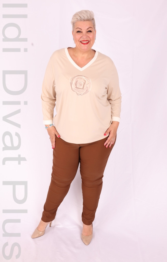 Livello Di Vita beige elején rózsás V nyakú hosszú ujjú felső.