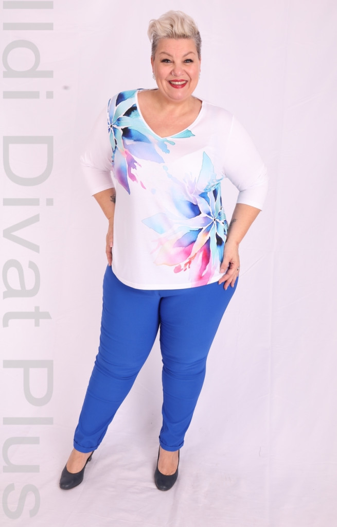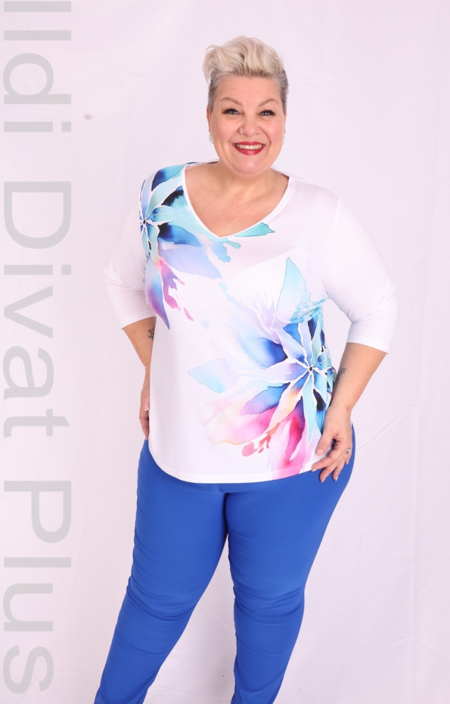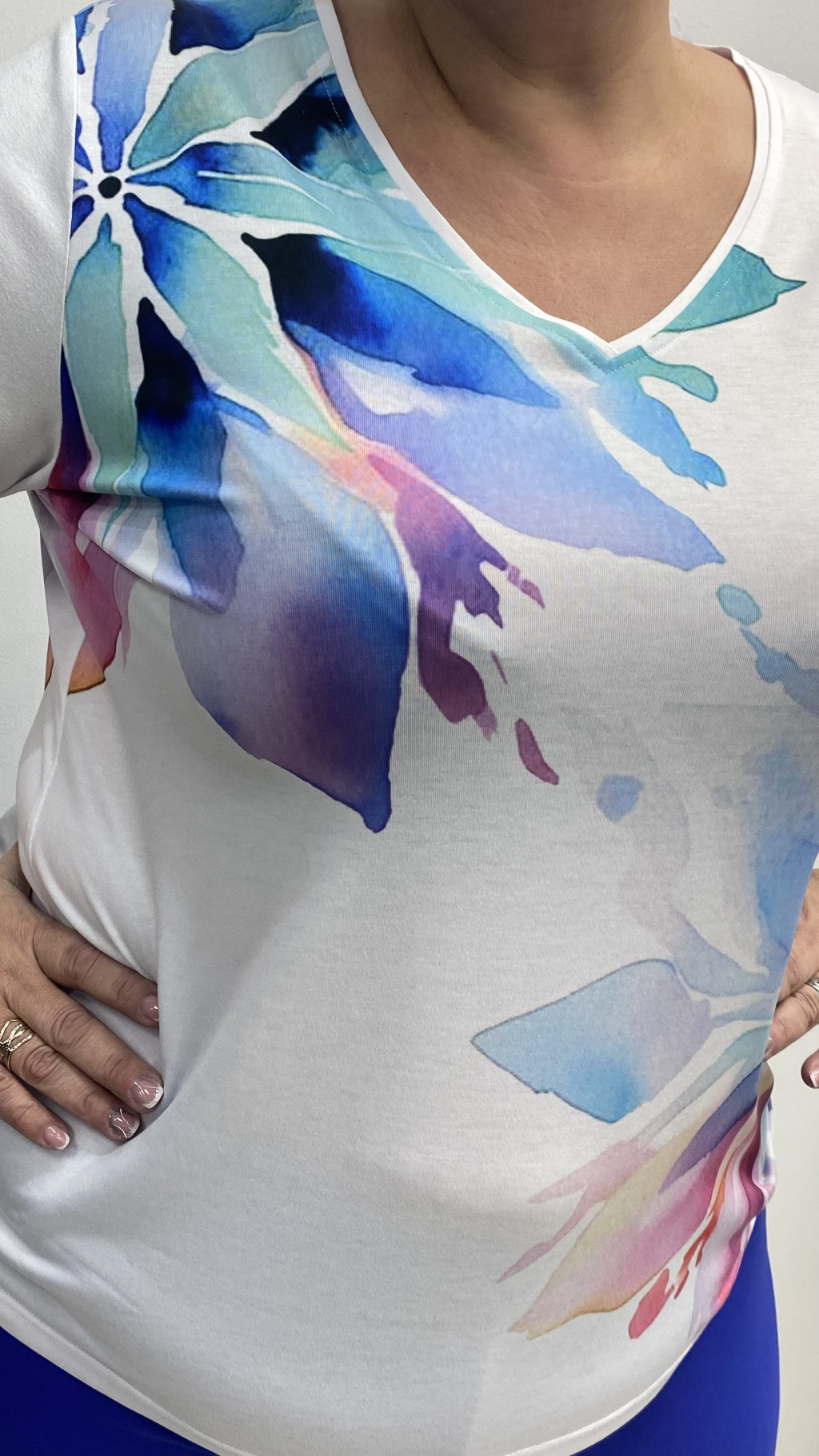 Livello Di Vita fehér alapon lila-türkiz virágmintás, V-kivágott, egyenes fazonú felső