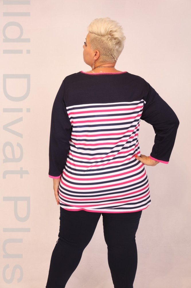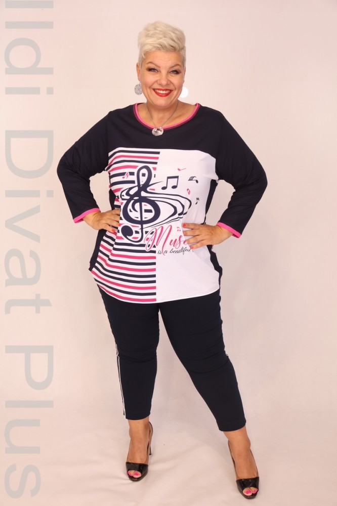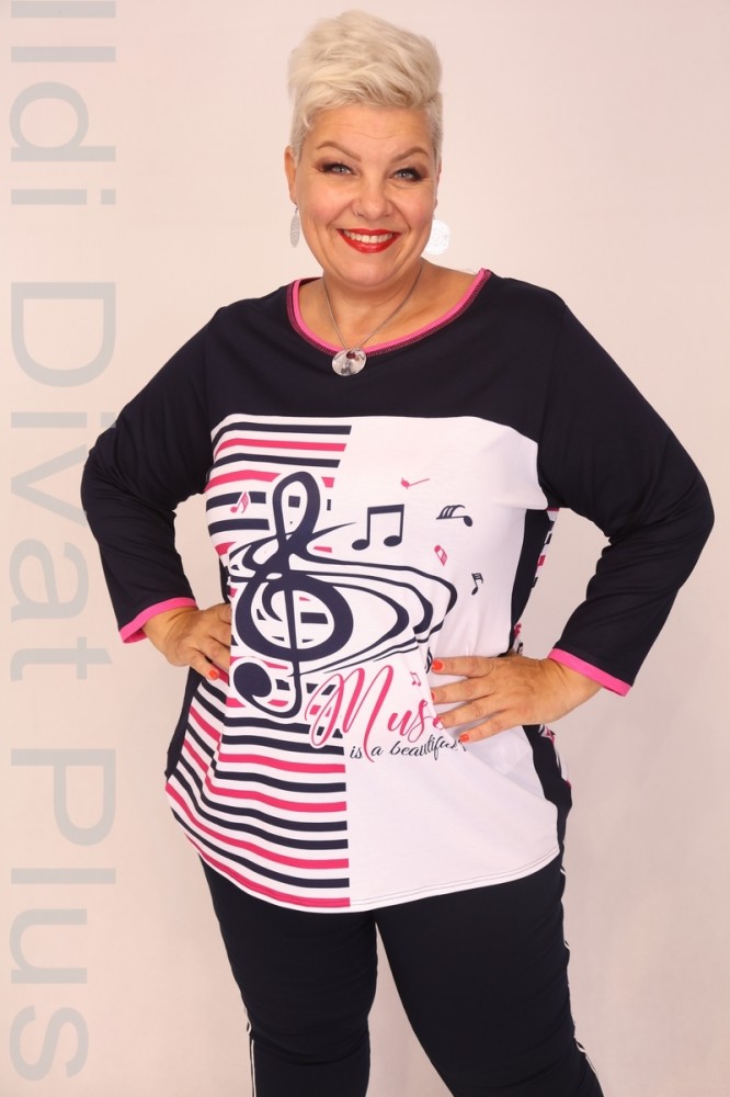 Livello Di Vita sötétkék-fehér-pink színű csíkos és hangjegy mintás, kerek nyakú, egyenes fazonú felső.