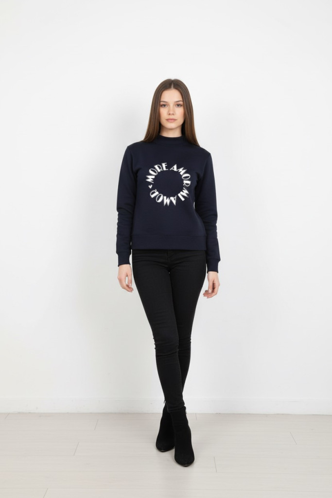 Micha sötétkék elején fehér mintás köves felső.