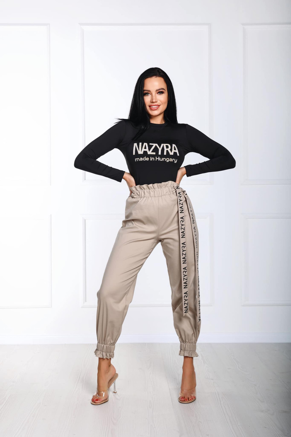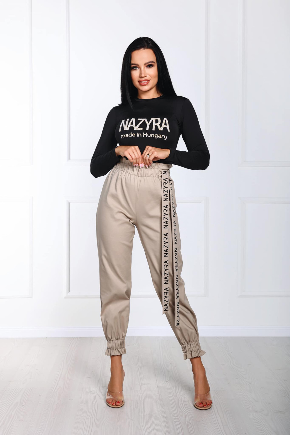 Nazyra homok színű, derekán és lábszár végén gumírozott, feliratos dísz megkötővel a derék részen, magasított derekú nadrág.