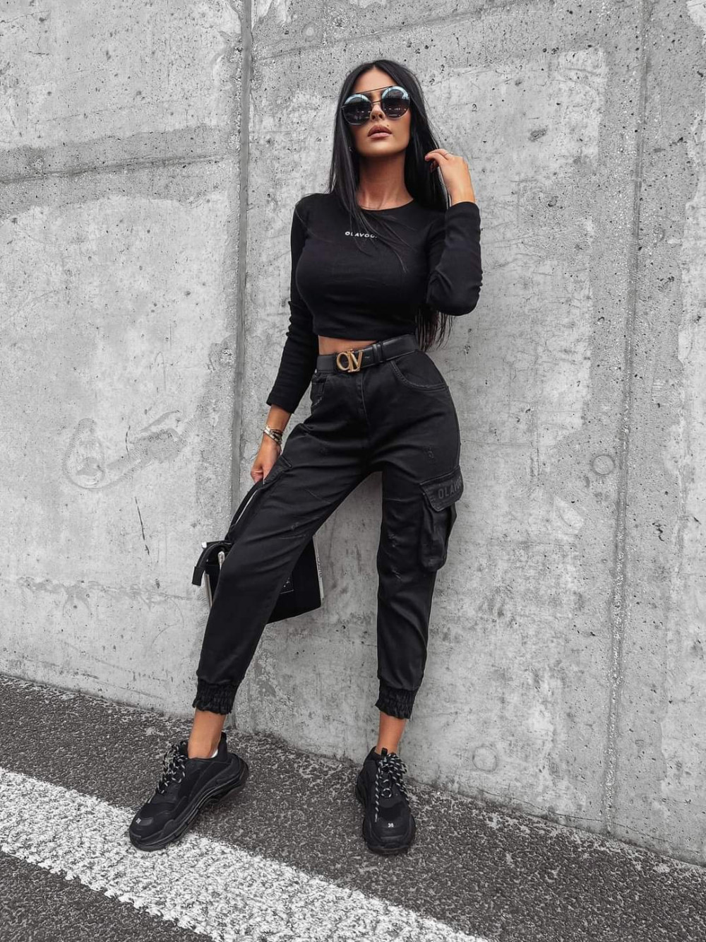 O'la Voga fekete színű, elején fehér feliratos, bordázott anyagú, rövidített fazonú felső.