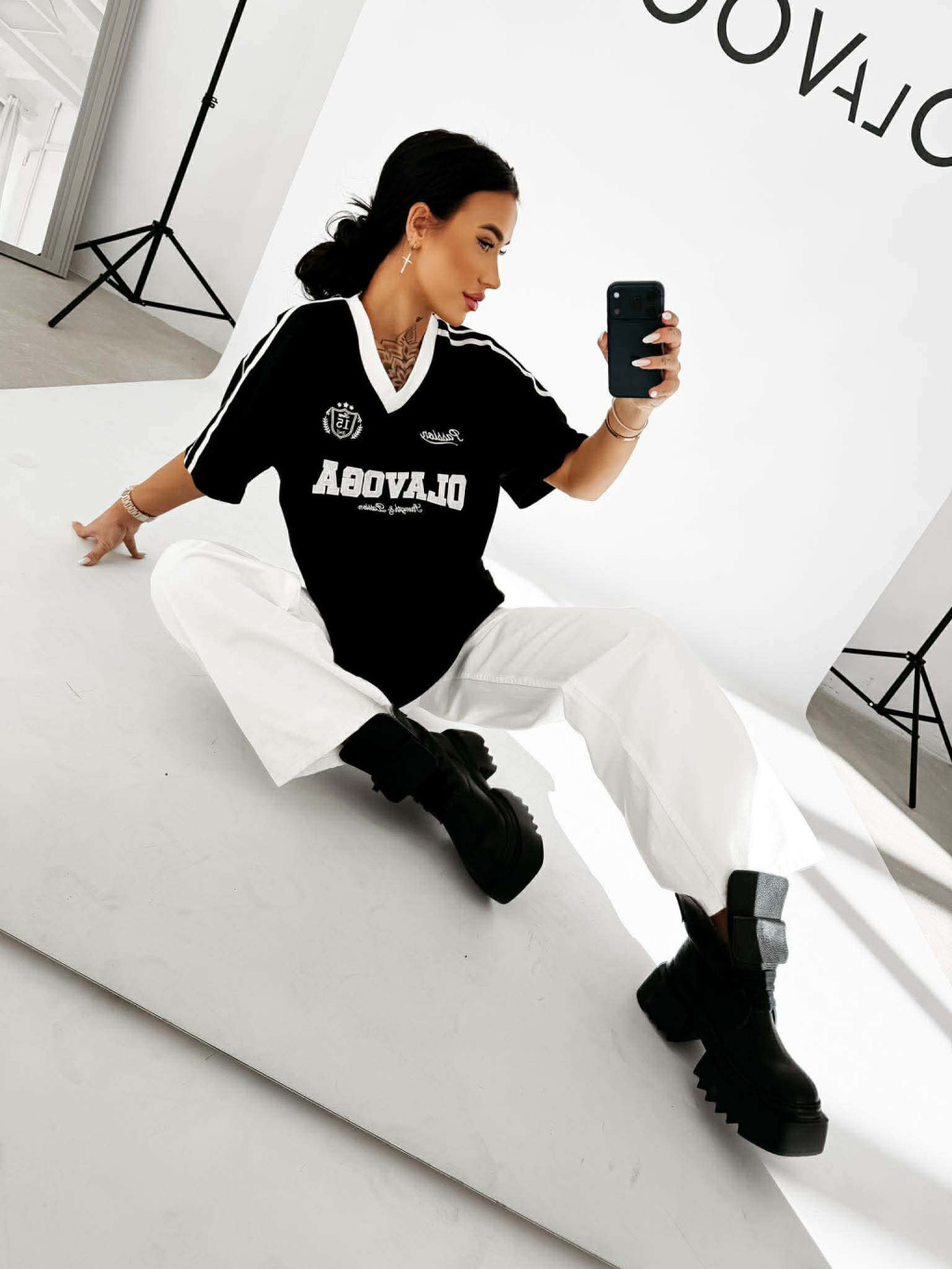 O'La Voga fekete alapon fehér hímzett V nyakú rövid ujjú felső