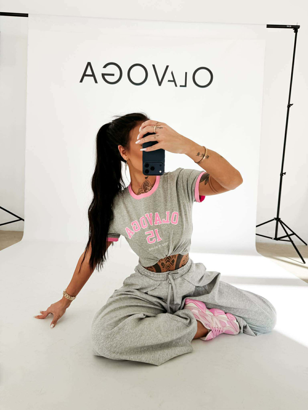 O'La Voga szürke alapon pink nyomott mintás rövid ujjú felső