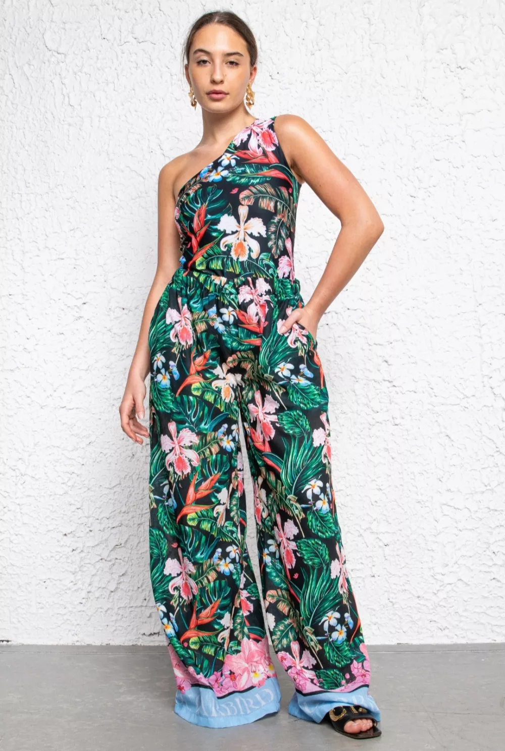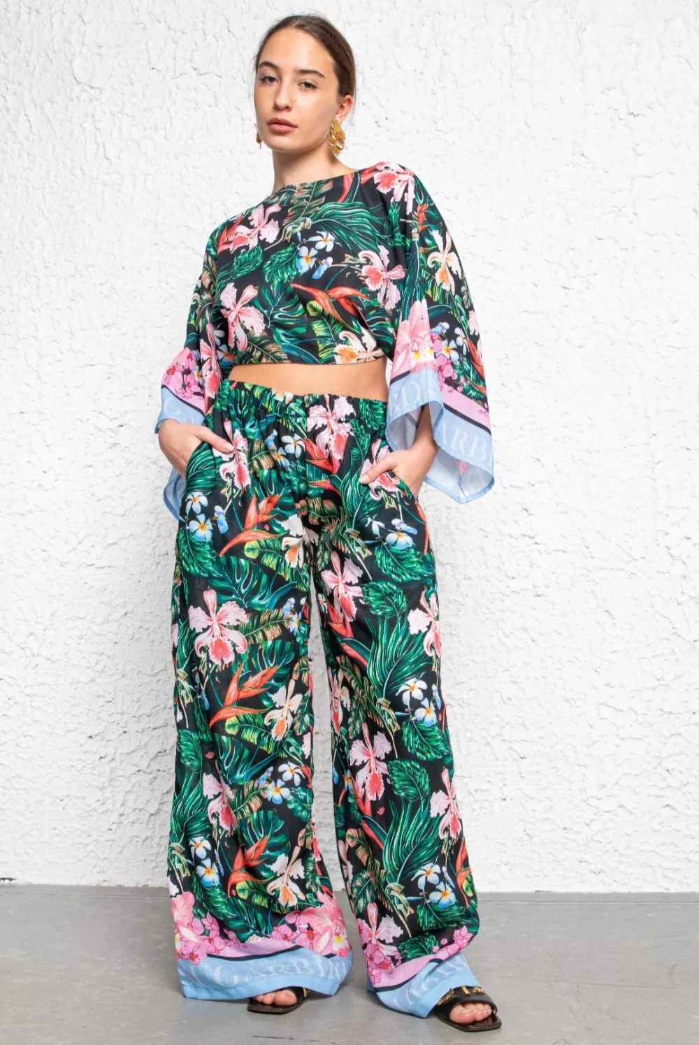 A fazon printelt mintáját fekete alapon trópusi virágok motívumai teszik a nyár egy különleges pillanatává.