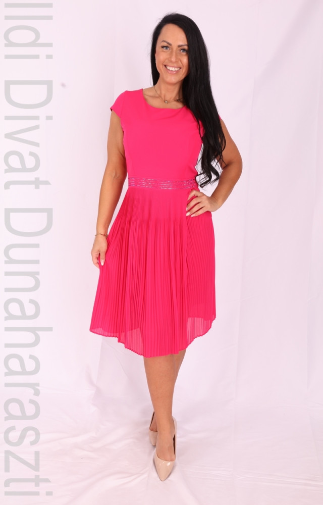 Bakap magenta színű, kerek nyakú, derék részén strassz díszítéses, alján pliszírozott, A-vonalú alkalmi ruha.