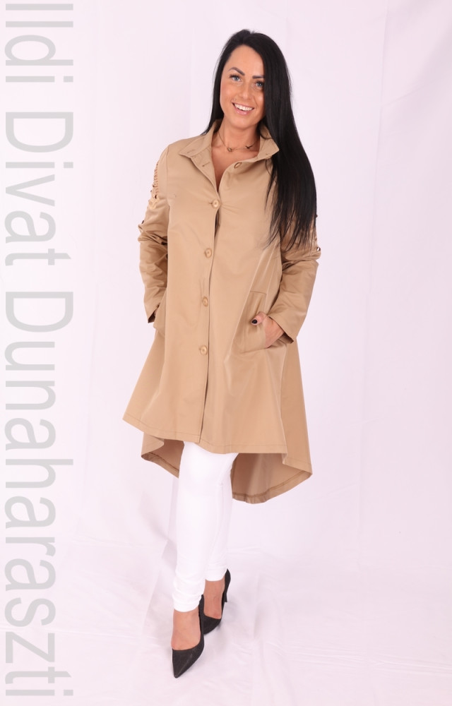 Spring Edition barna színű, galléros, váll részén hímzett, elején gombos, zsebes elején rövidebb, hátul hosszabb, lefelé bővülő fazonú ingtunika.