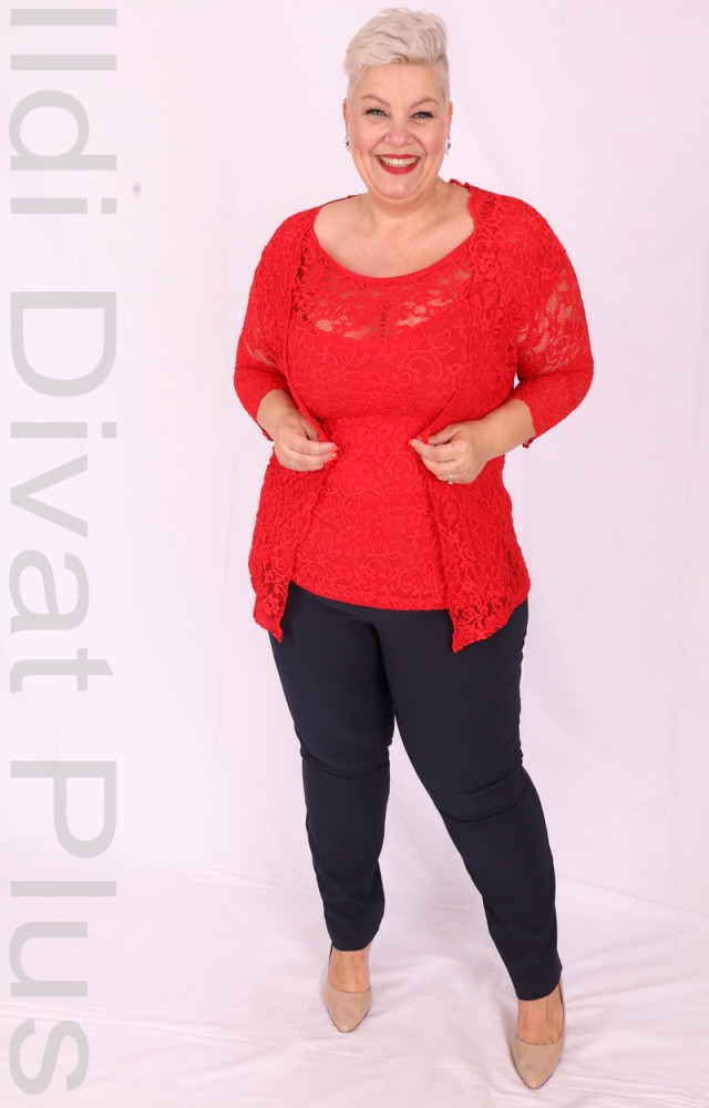 Zita piros színű, kerek nyakú, csipkés, egyenes fazonú felső.