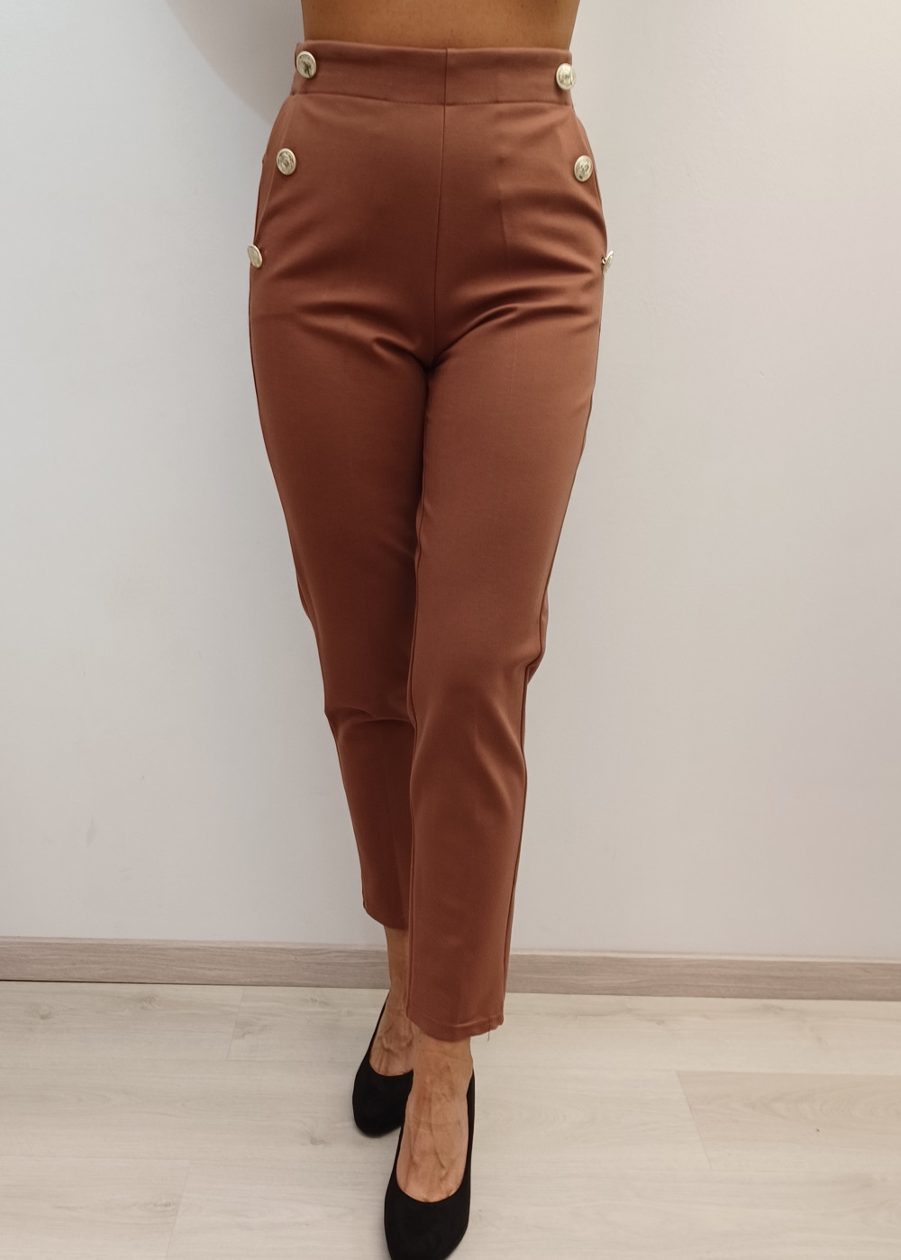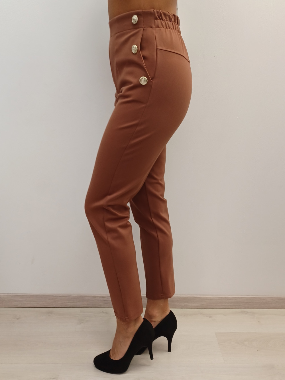 Csokibarna színű, arany gombos, gumis derekú nadrág.