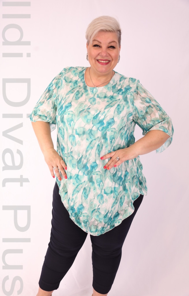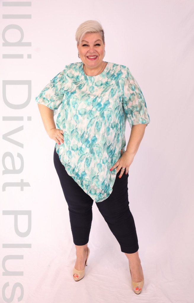 Eko zöld-fehée levélmintás aszimetrikus alkalmi tunika.