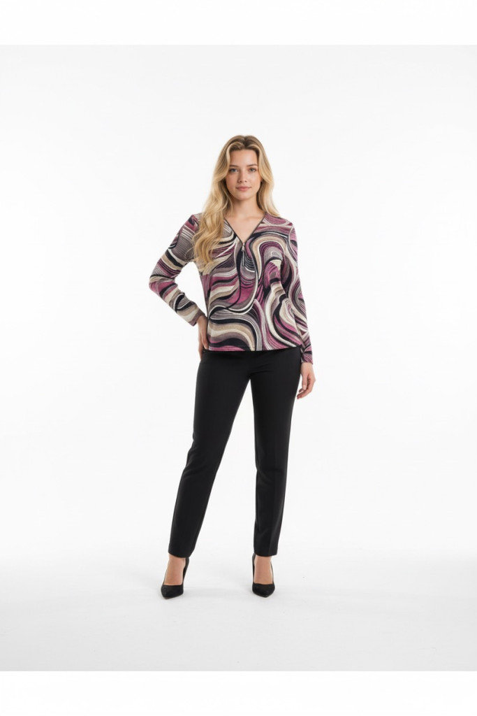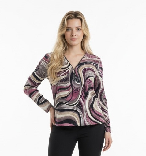 Ilona mályva-beige mintás zippes nyakú vékony kötött anyagú felső.
