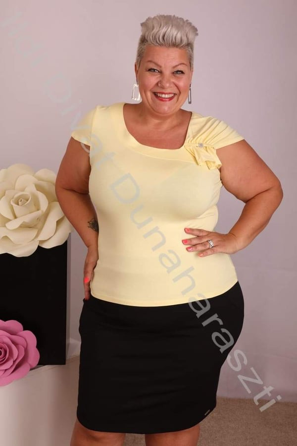 Privé sárga színű, fél vállán húzott és díszcsatos, karcsúsított fazonú felső.