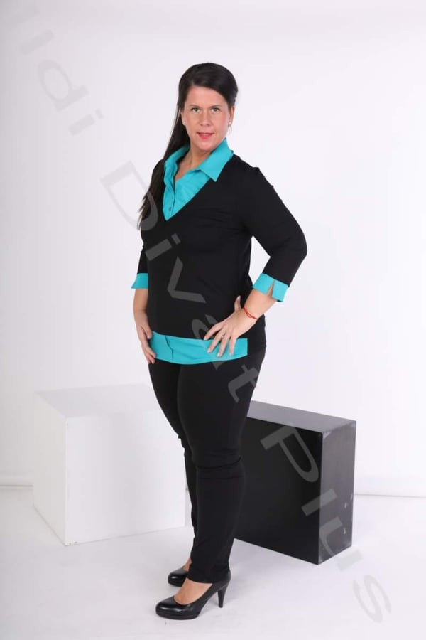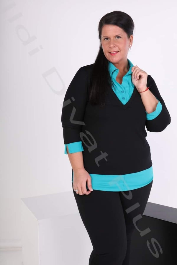 Caremo fekete-türkíz színű, ingbetétes, galléros, V-kivágott, egyenes fazonú felső