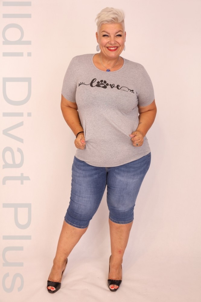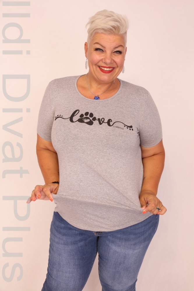 Caremo szürke színű, kerek nyakú, elején filmnyomott, karcsúsított fazonú felső.