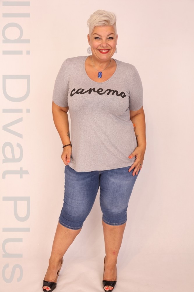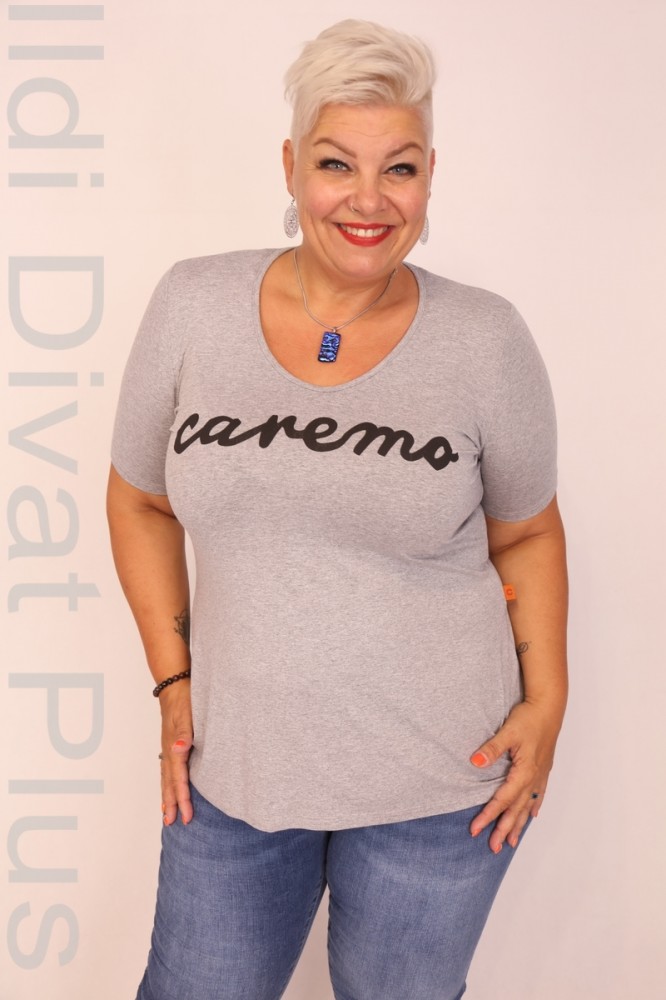 Caremo szürke színű, V-nyakú, elején filmnyomott, karcsúsított fazonú felső.