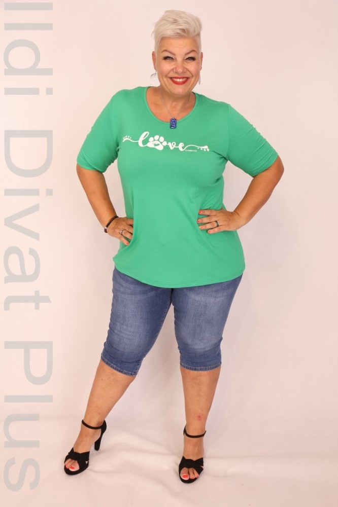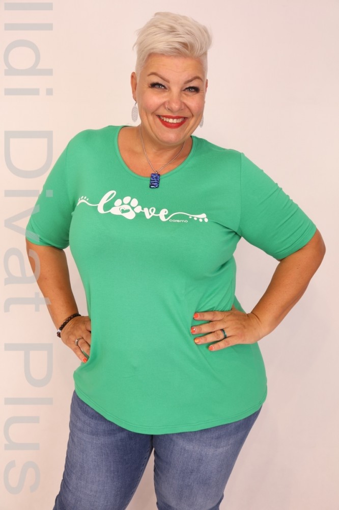 Caremo zöld színű, kerek nyakú, elején filmnyomott, karcsúsított fazonú felső.
