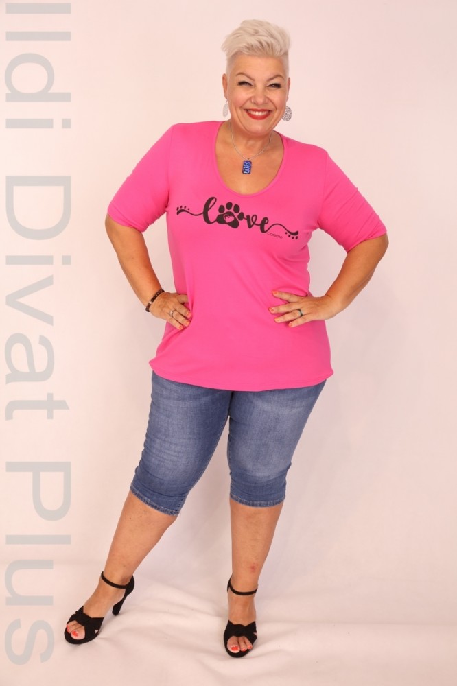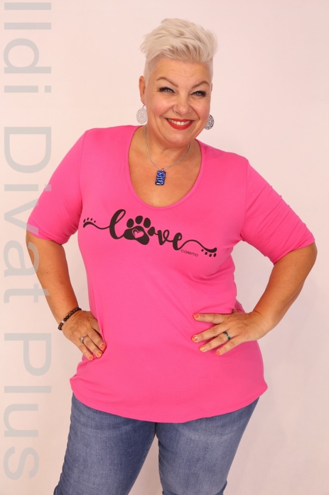 Caremo pink színű, V-nyakú, elején filmnyomott, karcsúsított fazonú felső.