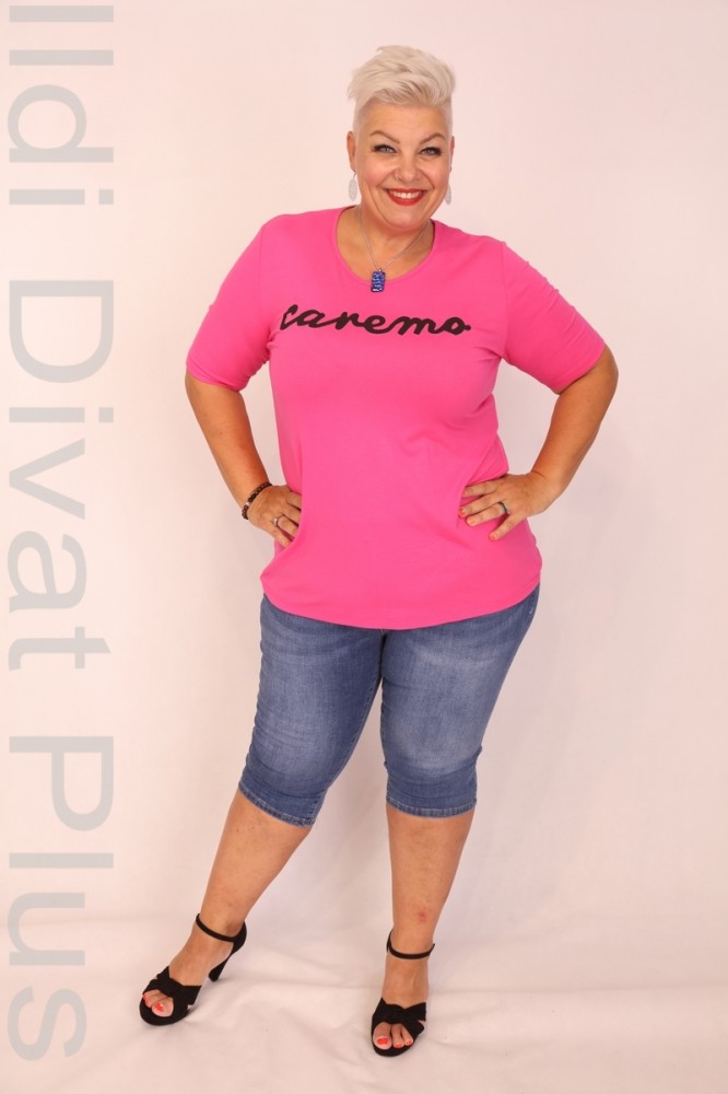 Caremo pink színű, kerek nyakú, elején filmnyomott, karcsúsított fazonú felső.