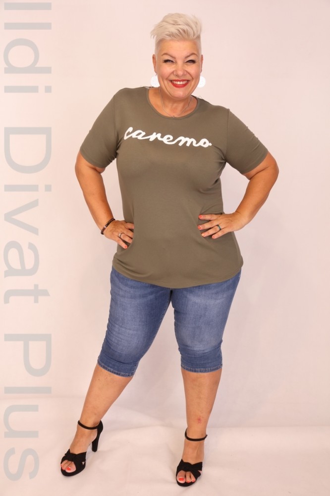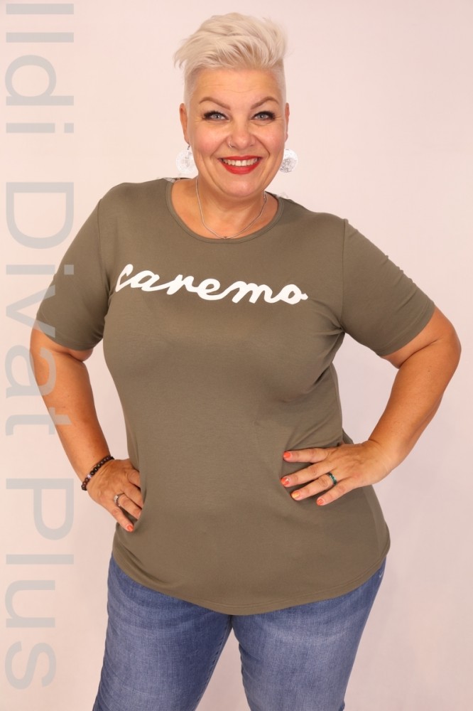 Caremo keki színű, kerek nyakú, elején filmnyomott, karcsúsított fazonú felső.