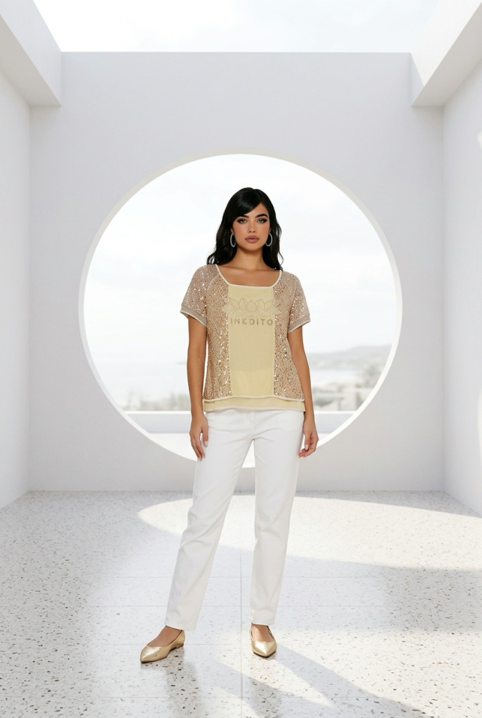 Elisa Cavaletti beige alapon flitteres köves rövid ujjú felső.
