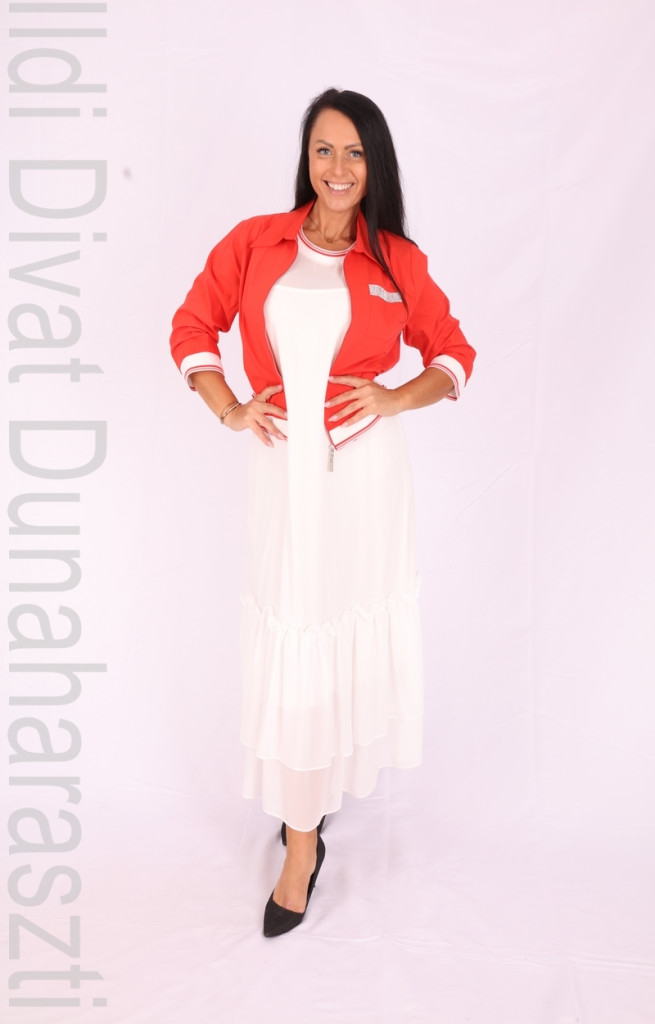 Fehér színű, fodros aljú ruha+piros színű, köves, cipzáras kabát.