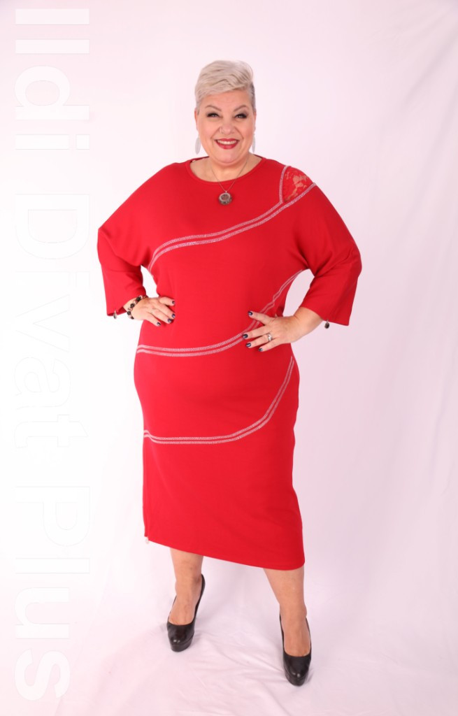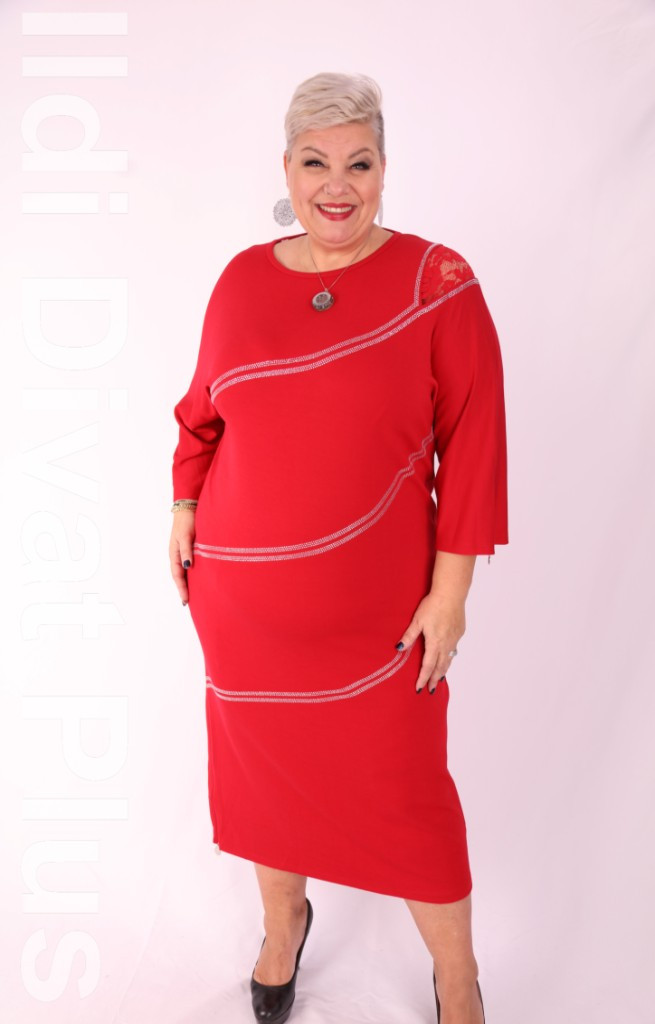 Krik piros alapon ezüst köves csipke betétes ruha.