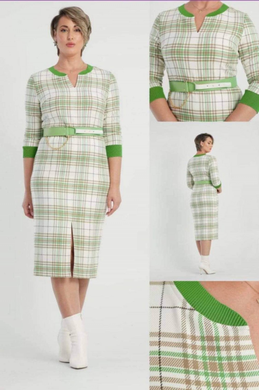 Ella zöld-barna kockás, V-kivágott, derekán megkötős, sliccelt, karcsúsított fazonú ruha.