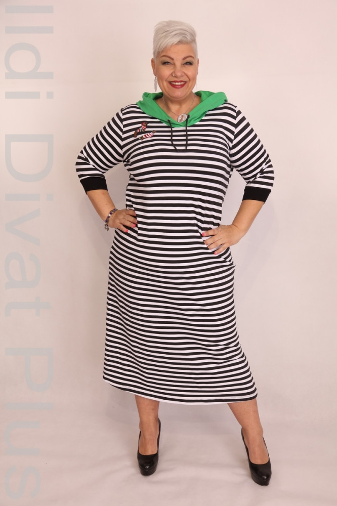 Darkwin fekete-fehér színű, zöld kapucnis, lefelé bővülő fazonú ruha.