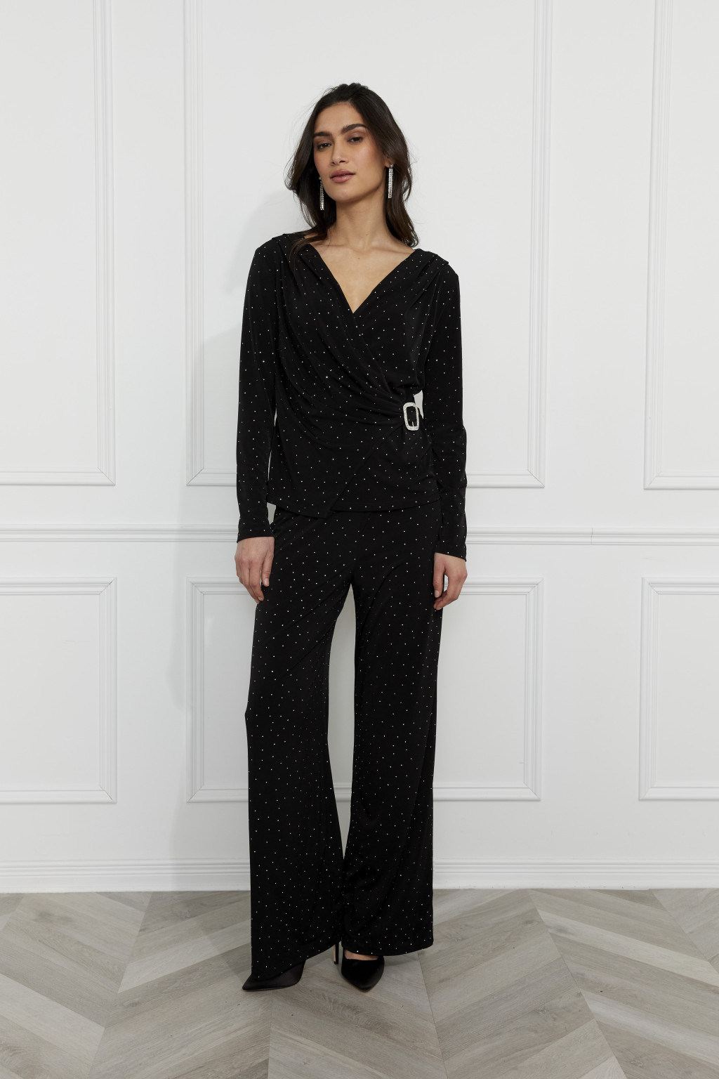 Frank Lyman fekete alapon ezüst köves mellén átlapolt oldalán ezüst csattos felső.