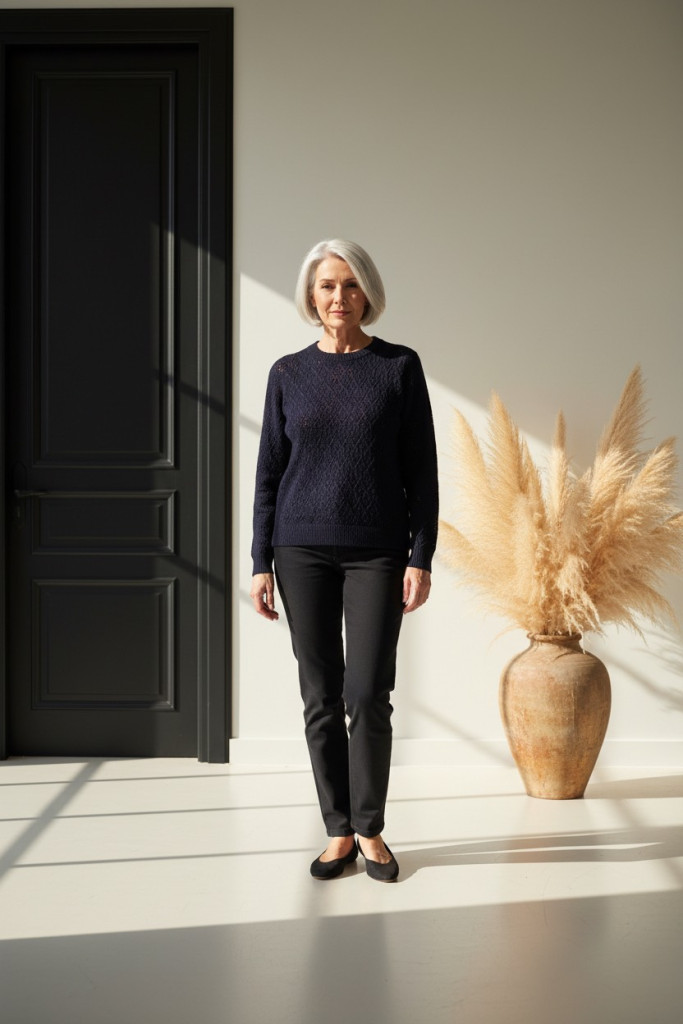 Micha sötétkék anyagában mintás vékony kötött felső.